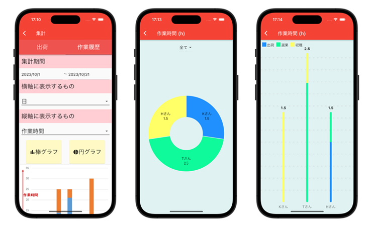 集計 農地ごとの収穫量や、作業者ごとの作業時間、 年度ごとの果実の出来具合などをグラフで表示し、 可視化することができます。 |