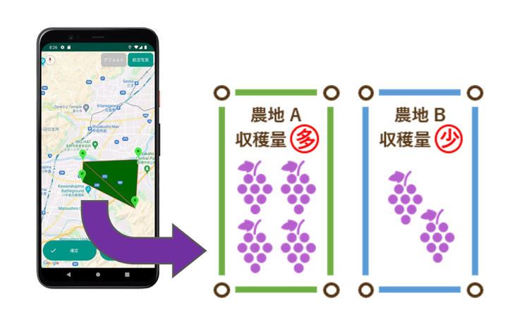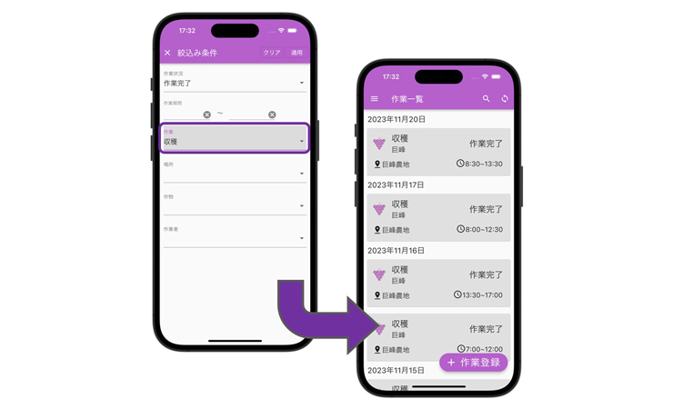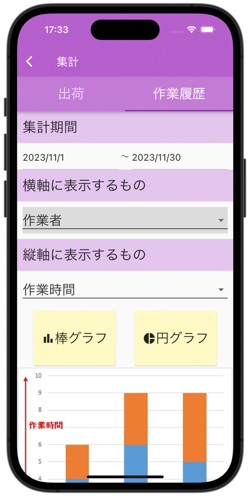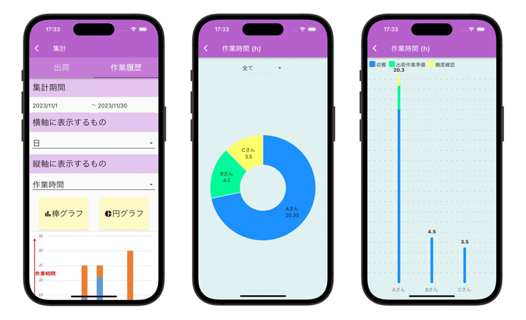 集計 農地ごとの収穫量や、作業者ごとの作業時間などを グラフで表示し、可視化することができます。 |